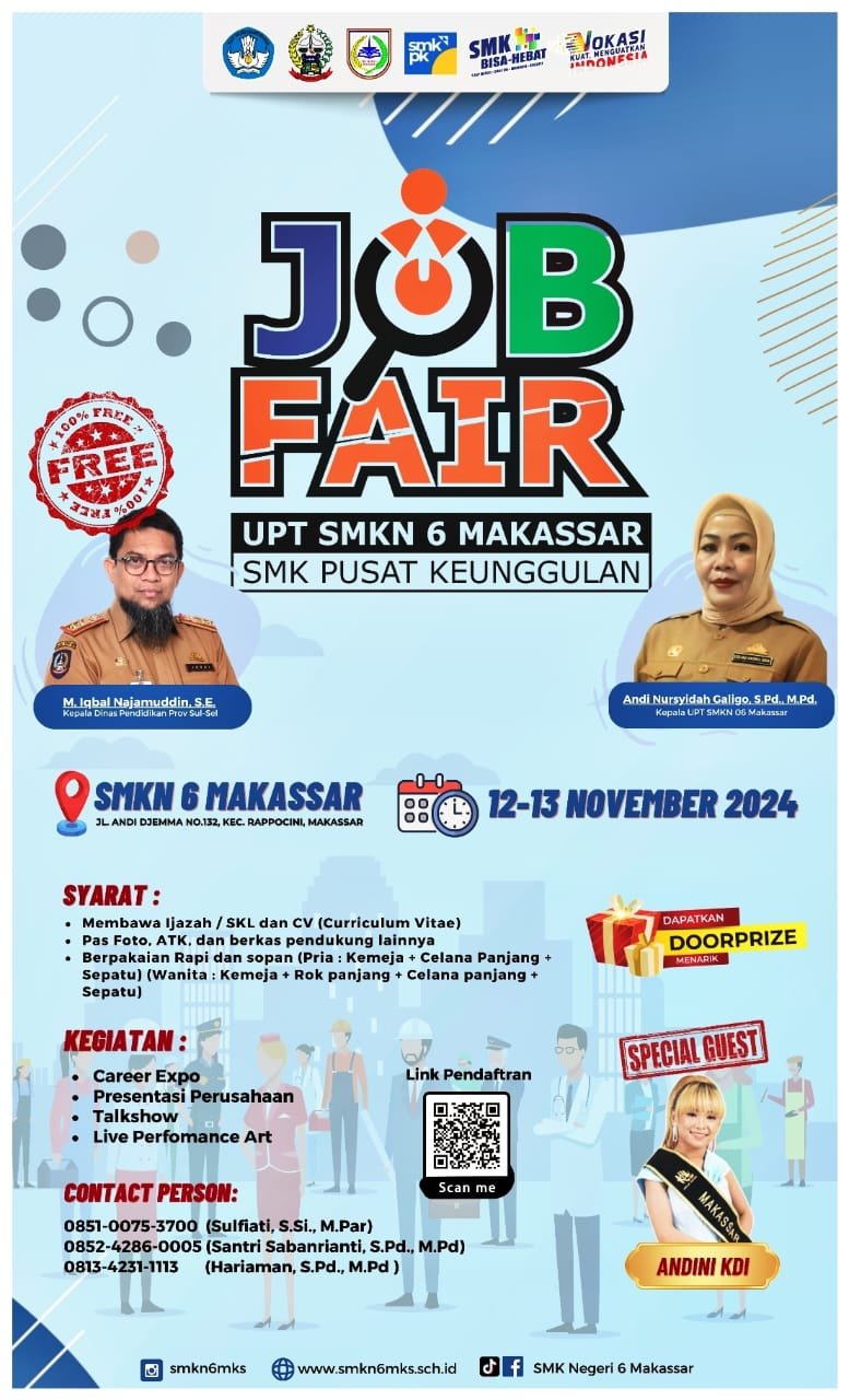 MAKASSAR,Ikolom.id – SMK Negeri 6 Makassar tengah mempersiapkan pelaksanaan kegiatan Job Fair yang rencananya akan dilaksanakan pada Selasa hingga Rabu 12-13 November 2024.