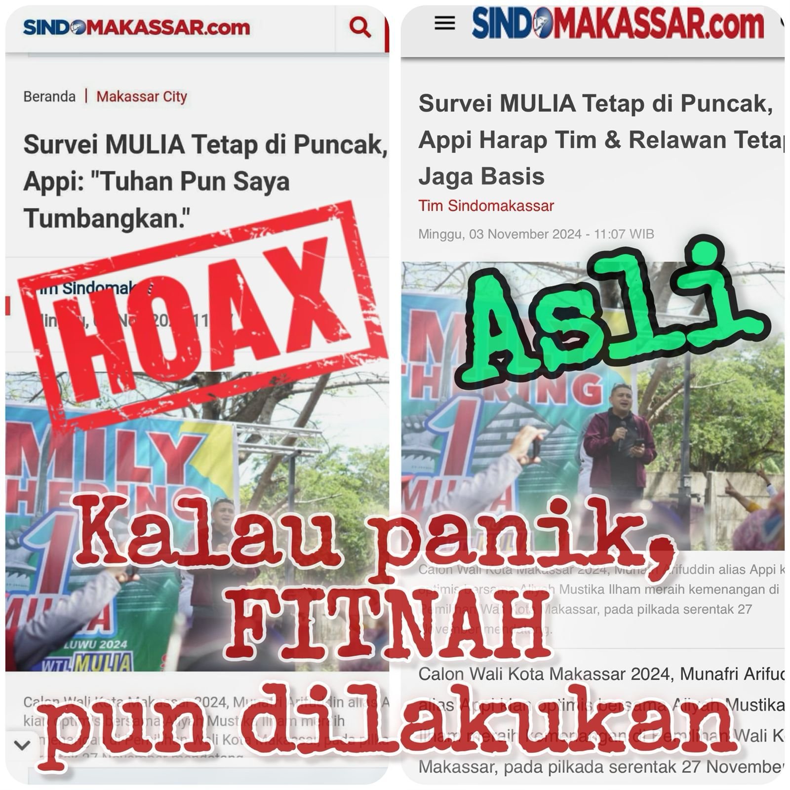 MAKASSAR,Ikolom.id – Berita Hoax kembali diarahkan ke Calon Walikota Makassar Munafri Arifuddin (Appi) di Grup WhatsApp Mimbar Pilkada Serentak Sulsel 2024.